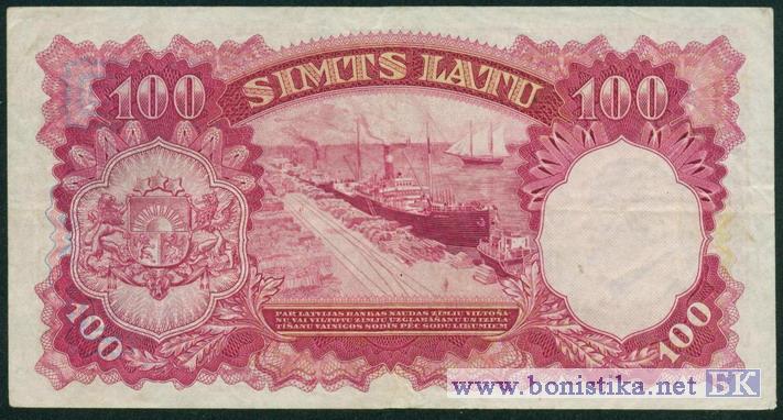 Подписи: председатель банковского совета - А.Кливе, генеральный директор - К.Ванагс Водяной знак: портрет К.Ульманиса (1877-1942) - 4-го президента Латвии.