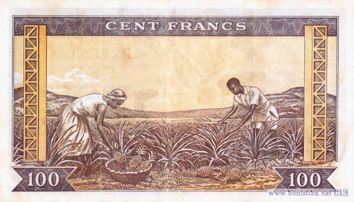 Первый президент, писатель Ахмед Секу Туре, ветвь с листьями и плодами оливкового дерева, или маслины европейской (Olea europaea) – вечнозелёного субтропического дерева семейства маслиновых. Горы, сборщики урожая на плантации ананасов.