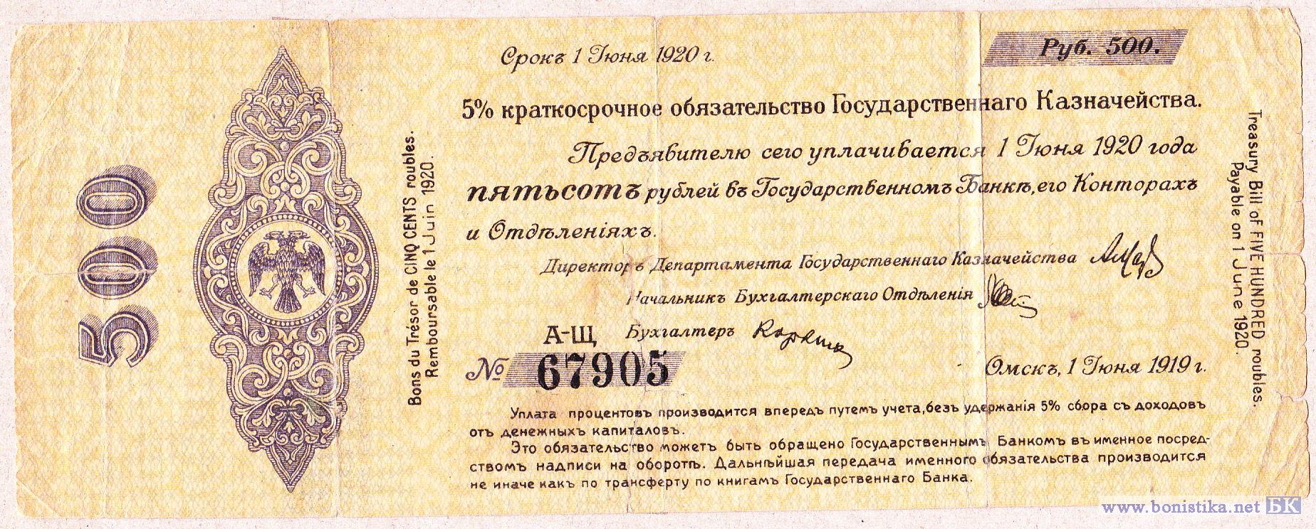 5% краткосрочное обязательство Государственного Казначейства. Срок 1 Июня 1920 г.