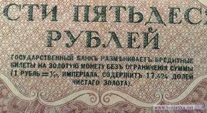 Выпуск правительства РСФСР. На 250 рублевых кредитных билетах выделяют два типа клише: на фото в данной банкноте показан первый и основной тип клише, отличие в цифре 17,244 долей по толщине 17 не имеют особого выражения и чуть больше по отношению к цифрам 424.