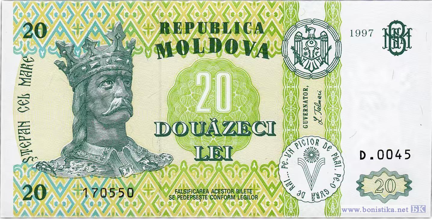 Преобладающие цвета, лицевая и оборотная сторона: зеленый и желтый. Отпечатана на специальной бумаге, содержащей водяной знак изображающий портрет Штефана чел Маре и внедренную вертикальную металлизированную нить. Аверс: Государственный герб Республики Молдова, надпись "REPUBLICA MOLDOVA", портрет Штефана чел Маре, многоцветный национальный орнамент, два вертикальных декоративных элемента, центральный гильош, номинальная стоимость в цифрах и буквах, художественно оформленная аббревиатура "BNM", факсимиле "GUVERNATOR, L. Talmaci", надпись по кругу "PE-UN PICIOR DE PLAI, PE-O GURA DE RAI...", стилизованное изображение литеры "V", год выпуска, номер и серия банкноты, надпись "FALSIFICAREA ACESTOR BILETE SE PEDEPSE^TE CONFORM LEGILOR". Реверс: Внутри рамы графическое изображение Крепости Сорока и надпись "CETATEA SOROCA", номинальная стоимость в цифрах и буквах, два вертикальных декоративных элемента, герб Штефана чел Маре, стилизованное изображение колонны Трояна, Колонны Бесконечности и между ними полумесяц, название эмиссионного банка "BANCA NAbIONAL A MOLDOVEI", художественно оформленная аббревиатура "BNM". Защитные элементы: темный водяной знак, изображающий портрет Штефана чел Маре направленный к центру, просматриваемый на просвет; металлизированная защитная нить, внедренная между портретом Штефана чел Маре и центральным гильошом, просматриваемой на просвет; при рассмотрении банкноты на просвет: должны совпадать внешний контур стилизованных изображений солнца на лицевой стороне и полумесяца на оборотной стороне, а также круг солнца с кругом, в который вписан полумесяц. Буква "V" на лицевой стороне и изображение Колонны Трояна и Колонны Бесконечности на оборотной стороне при совмещении должны образовать силуэт буквы " M" (Moldova).