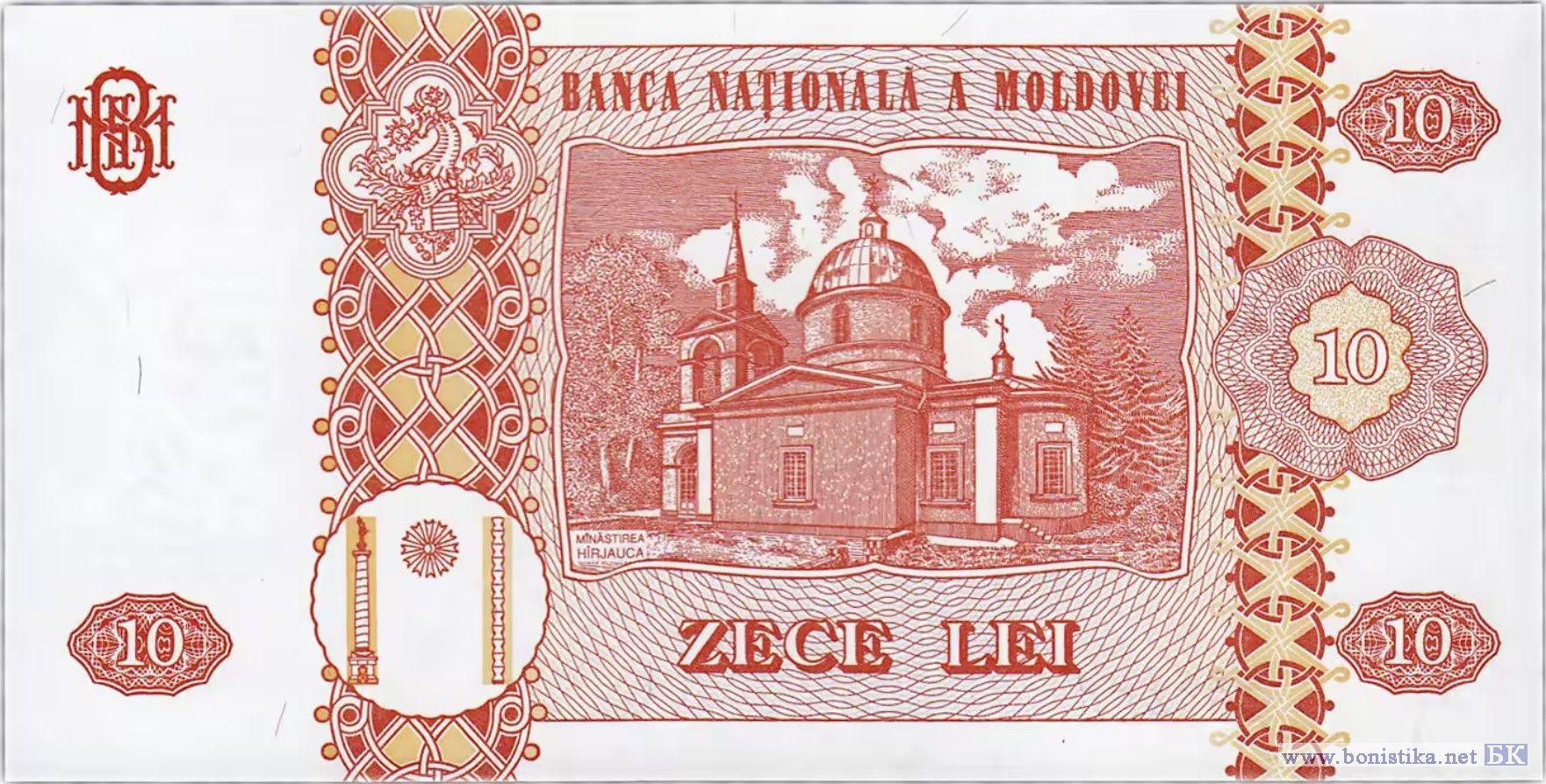 Преобладающие цвета, лицевая и оборотная сторона: красный, фиолетовый и цвет золотой охры. Отпечатана на специальной бумаге,содержащей водяной знак изображающий портрет Штефана чел Маре и внедренную вертикальную металлизированную нить. Аверс: Государственный герб Республики Молдова, надпись "REPUBLICA MOLDOVA", портрет Штефана чел Маре, многоцветный национальный орнамент, два вертикальных декоративных элемента, центральный гильош, номинальная стоимость в цифрах и буквах, художественно оформленная аббревиатура "BNM", факсимиле " GUVERNATOR, L. Talmaci", надпись по кругу "PE-UN PICIOR DE PLAI, PE-O GURA DE RAI...", стилизованное изображение литеры "V", год выпуска, номер и серия банкноты, надпись "FALSIFICAREA ACESTOR BILETE SE PEDEPSESTE CONFORM LEGILOR". Реверс: Внутри рамы графическое изображение Монастыря Хыржаука и надпись "MANASTIREA HОRJAUCA", номинальная стоимость в цифрах и буквах, два вертикальных декоративных элемента, герб Штефана чел Маре, стилизованное изображение колонны Трояна, Колонны Бесконечности и между ними полумесяц, название эмиссионного банка "BANCA NATIONALA A MOLDOVEI", художественно оформленная аббревиатура "BNM". Защитные элементы: темный водяной знак, изображающий портрет Штефана чел Маре направленный к центру, просматриваемый на просвет; металлизированная защитная нить, внедренная между портретом Штефана чел Маре и центральным гильошом, просматриваемой на просвет; при рассмотрении банкноты на просвет: должны совпадать внешний контур стилизованных изображений солнца на лицевой стороне и полумесяца на оборотной стороне, а также круг солнца с кругом, в который вписан полумесяц. Буква "V" на лицевой стороне и изображение Колонны Трояна и Колонны Бесконечности на оборотной стороне при совмещении должны образовать силуэт буквы "M" (Moldova).