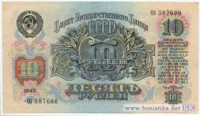 Ходили до реформы 1961 года. Всего было выпущено две разновидности купюр, отличающихся числом витков ленты в гербе СССР: у первого выпуска их было 16, у второго (1957 года) -15. Соответственно изменилось и число надписей "десять рублей" на языках союзных республик. Использовалось 2 типа шрифта (в шрифте было 25 букв).