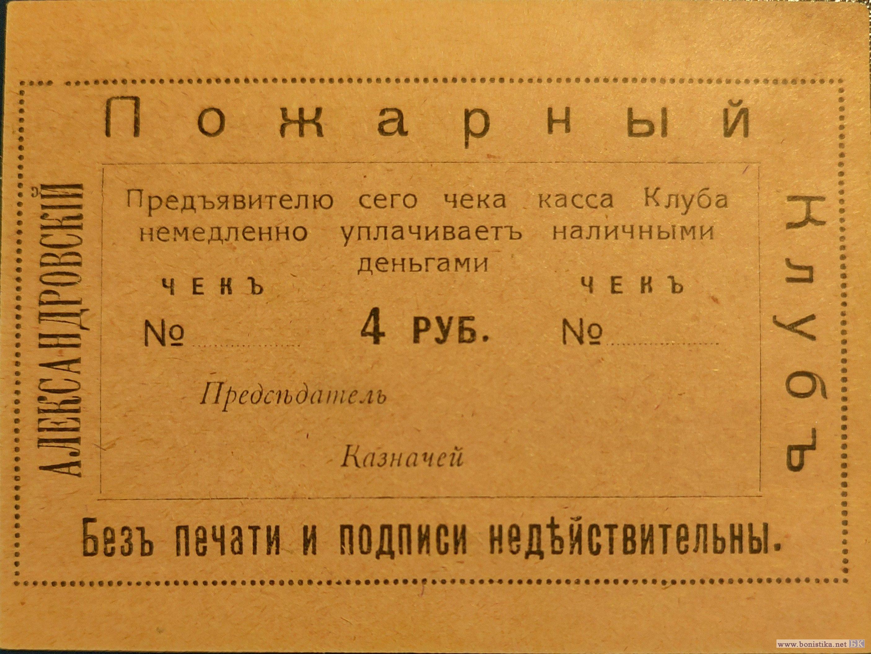 Після загальних зборів правління та членів добровільного пожежного товариства 21 листопада 1917р. було вирішено відкрити клуб «Пожежники» на комерційній основі, який приносив би прибуток товариству. Скоріше за все саме до цього періоду відносяться бони номіналом у 1,2,3,4 рублі., так як робота клуба неефективною та збитковою у квітні 1918р. на засіданні було ухвалено рішення реорганізувати клуб «Пожежники» в клуб-лото.