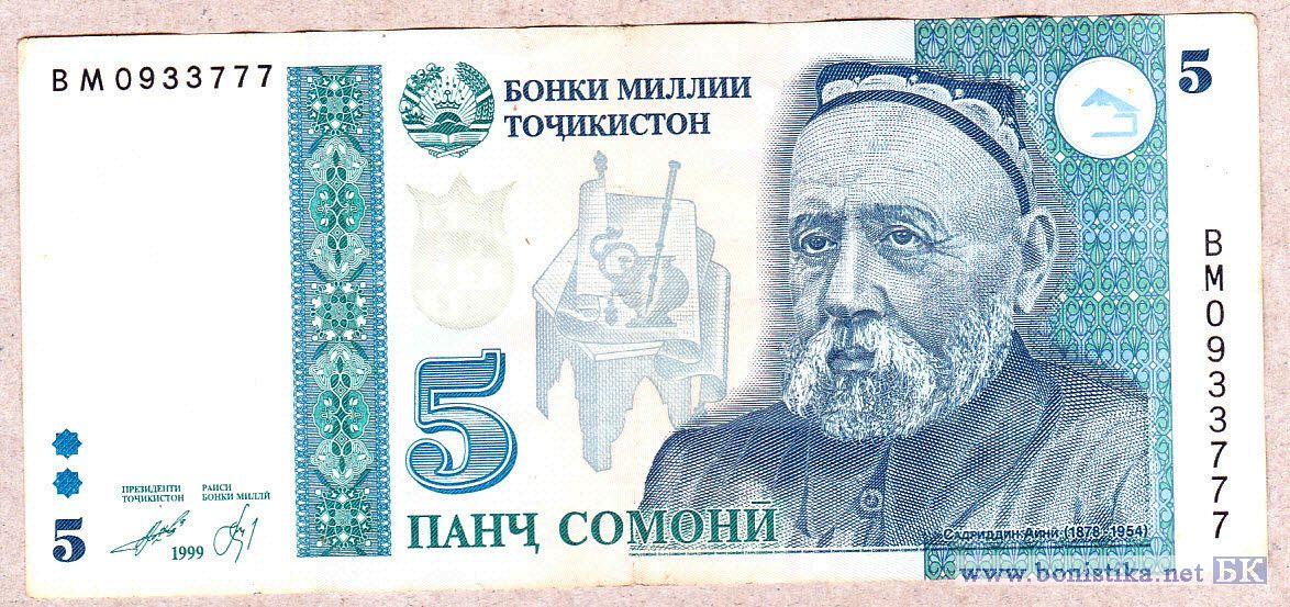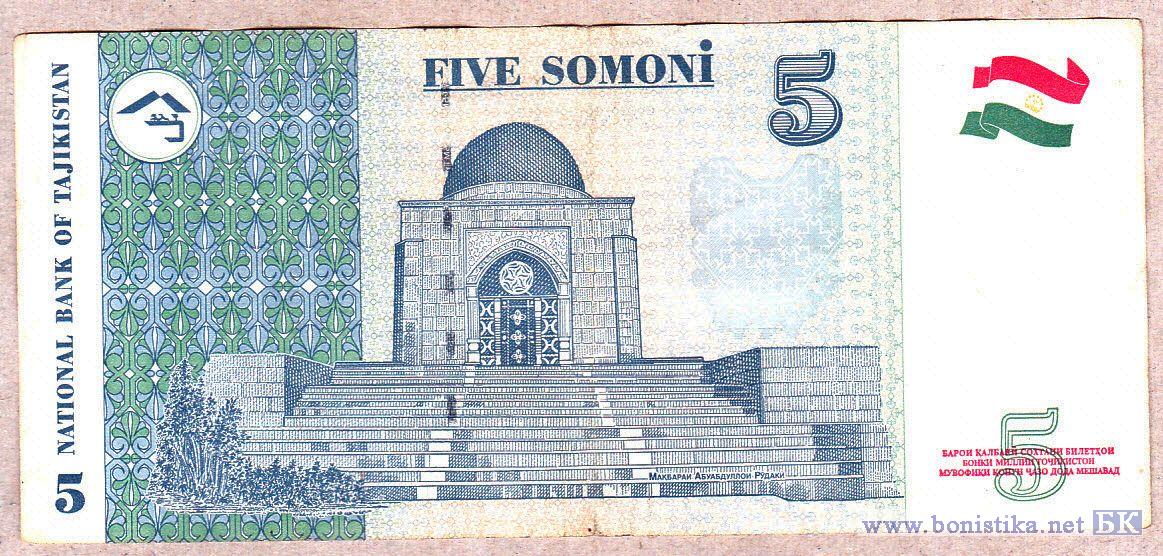Выпуск 2010 г. Аверс: портрет Садриддина Айни (1878-1954). Реверс: изображение мавзолея Абуабдулло Рудаки. Водяной знак: Садриддин Айни. Основное отличие - цвет столика с бумагой и чашей на аверсе - синий (на 5 сомони 1999 - серо-зеленый)