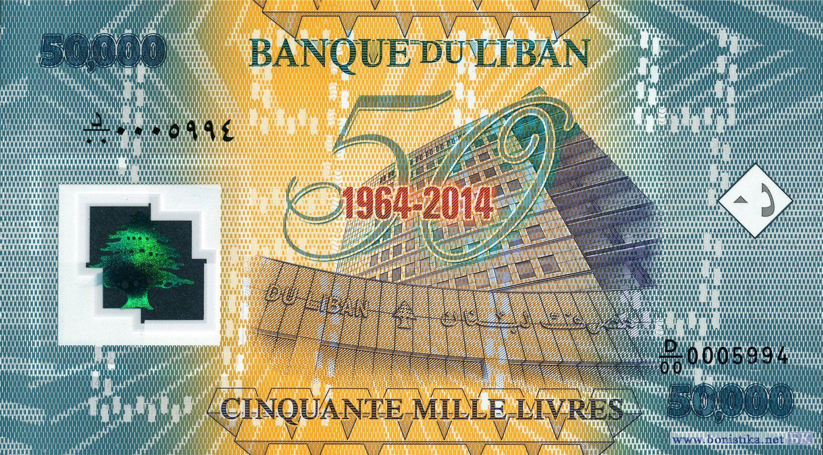 Полимерная банкнота, выпущенная в честь 50-летия Банка Ливана.