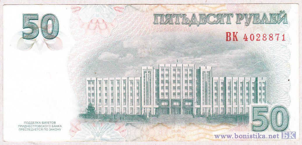 В центре – изображение здания Верховного Совета и Правительства Приднестровской Молдавской Республики. Слева вверху на чистом поле – крупная цифра «50», внизу – текст «ПОДДЕЛКА БИЛЕТОВ ПРИДНЕСТРОВСКОГО БАНКА ПРЕСЛЕДУЕТСЯ ПО ЗАКОНУ». Справа вверху – надпись «ПЯТЬДЕСЯТ РУБЛЕЙ», под ней – серия из двух заглавных букв и семизначный номер. Справа внизу – крупная цифра «50».