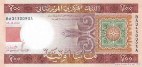 Вариант подписей № 12: Mohamad Ould Sidna - Sid Ahmed Ould Raiss. Принтер: Giesecke & Devrient. Банкнота выпущена в обращение в 2014 году.