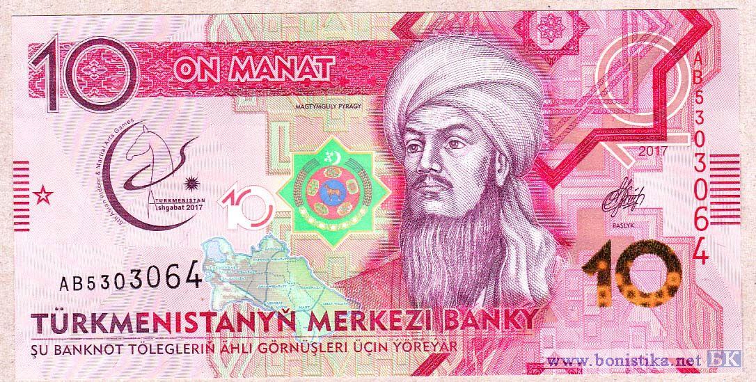 12.09.2017 г.В честь V Азиатских игр в закрытых помещениях и по боевым искусствам Центральный банк Туркменистана ввел в обращение новые, модифицированные банкноты номиналом 1, 5, 10, 20, 50 и 100 манатов