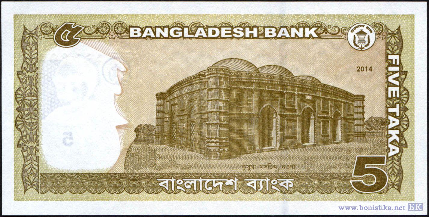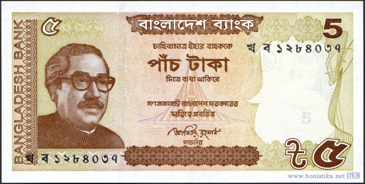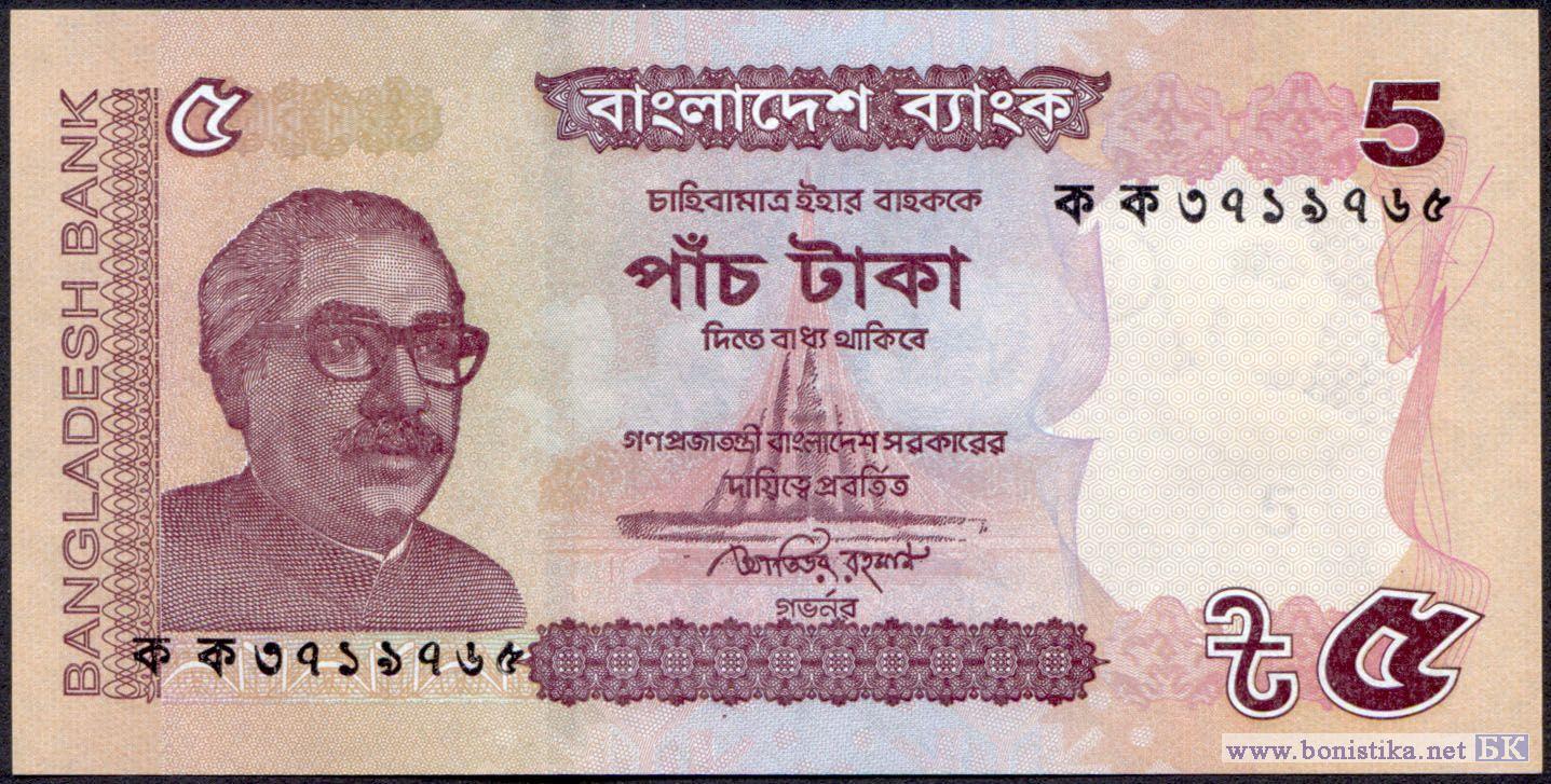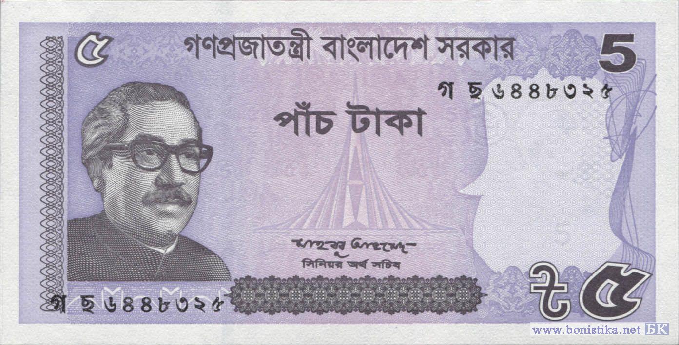Подпись: Mahbub Ahmed (министр финансов). Основной цвет - фиолетовый. На лицевой стороне изображен первый президент, премьер-министр, шейх Муджибур Рахман и Джатио Срити Судхо, национальный мемориал мучеников освободительной войны. На обороте изображена мечеть Кушумба.
