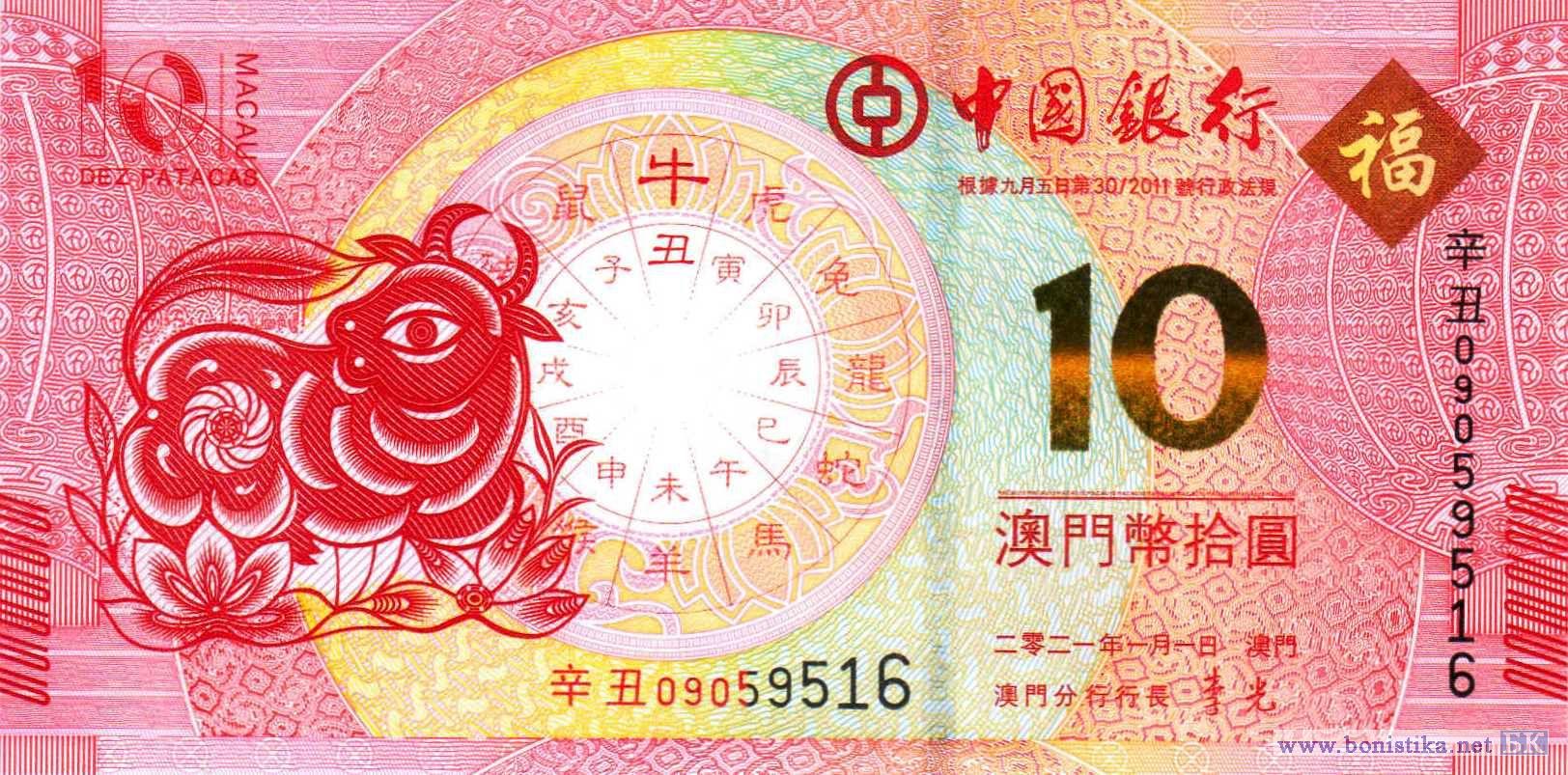 Стилизованное изображение быка и цветов - второго знака китайского зодиака. Здание банка Китая в городе Аомынь, играющие дети перед воротами даосского храма А-Ма на холме Барра в честь богини Мацзу - покровительницы мореходов, бык, цветы.