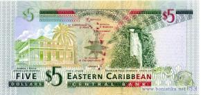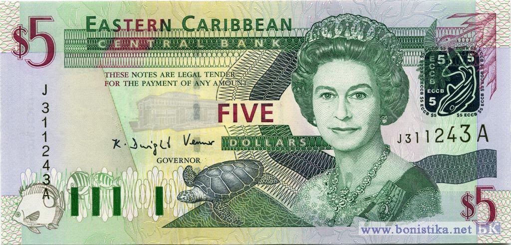В составе Карибских островов существует отдельная группа - EAST CARRIBEAN STATES, в состав которой входит Антигуа, на которой была выпущена данная купюра. Слева внизу располагаются полоски зелёного цвета (три и одна) - это классификатор острова, где была выпущена купюра. Так как купюра без указания года, то год определяется по картинке справа от королевы. В данном случае (серебрянного цвета фольга - рыбка и номинал) - 2003 г.