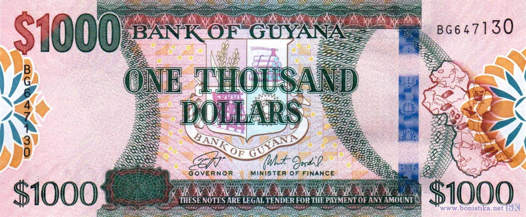Эмблема банка, карта Гайаны с символами полезных ископаемых, производимого сырья и продуктов. Здание банка в городе Джорджтаун, обелиск.