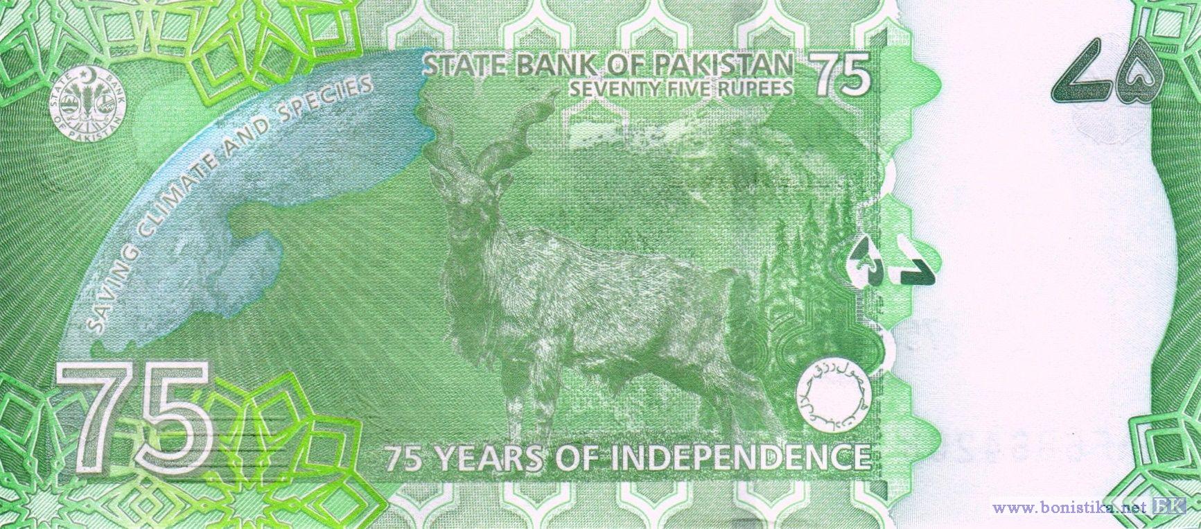 Юбилейная банкнота: 75-летие независимости. Мусульманский реформатор, богослов, философ, педагог, государственный деятель, юрист, один из авторов «теории двух наций» Сайед Ахмад-хан; оппозиционный политический и общественный деятель, основательница Всеиндийской мусульманской федерации женщин-студентов Мохтарма Фатима Джинна (Мадар-и-Миллат или Мать нации), младшая сестра Мухаммада Али Джинны; лидер партии Мусульманская лига, первый генерал-губернатор Мухаммад Али Джинна; поэт, политик, общественный деятель, учёный, адвокат, философ, мыслитель, «духовный отец» Пакистана сэр Аллама Мухаммад Икбал, логотип празднования 75-летия независимости. Эмблема Государственного банка, фрагмент планеты Земля, винторогий козёл, или мархур (змееед) (Capra falconeri) – китопарнокопытное млекопитающее семейства полорогих, горы, кедры гималайские, или деодары (Cedrus deodara) – хвойные деревья семейства сосновых.