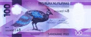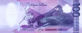 Стилизованное изображение цветка цератоцентрона (Ceratocentron fesselii) – растения семейства орхидных, самец палаванского павлиньего фазана (Polyplectron napoleonis) – курообразной птицы семейства фазановых, является эндемиком острова Палаван, новая эмблема Центрального банка. Карта Филиппин, стратовулкан Майон в национальном парке «Вулкан Майон» в регионе Биколь на острове Лусон, китовые акулы (Rhincodon typus) – пелагические акулы семейства ринкодонтовых, крупнейшие из современных рыб, стилизованное изображение цветка цератоцентрона, фрагмент дизайна текстиля Бикольского региона.