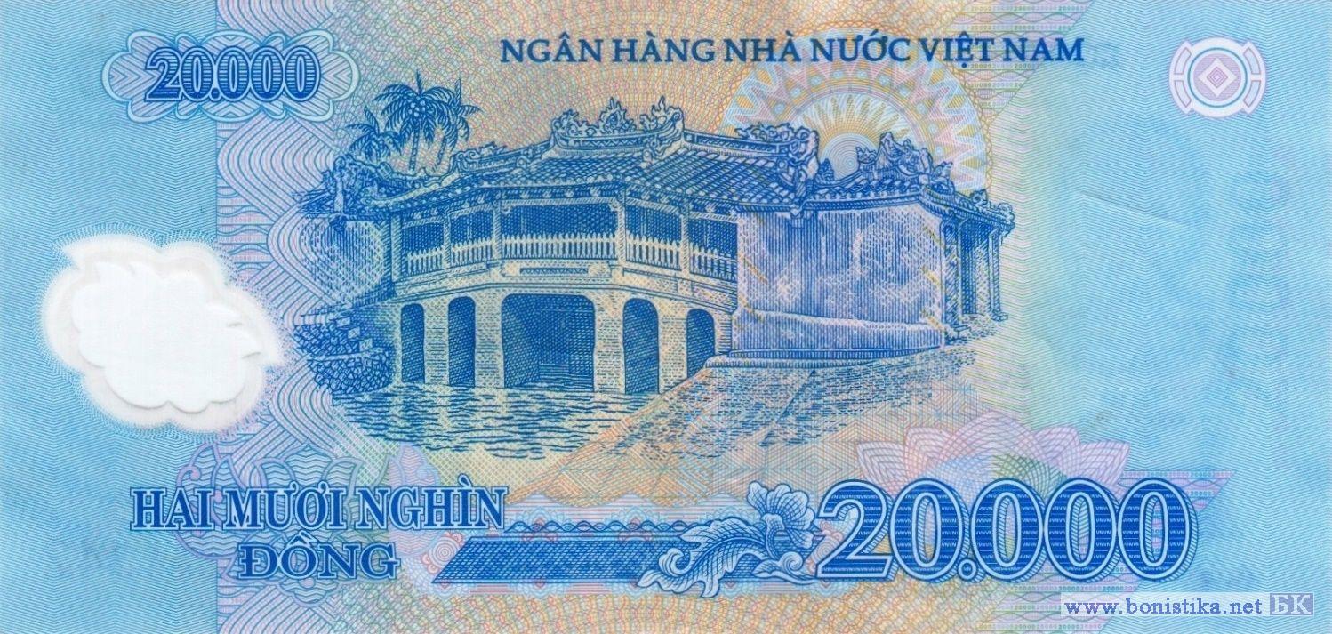 Революционер, партийный, государственный и военный деятель, основатель Коммунистической партии Вьетнама, руководитель Августовской революции 1945 года, первый президент Нгуен Шинь Кунг (Хо Ши Мин). Японский крытый деревянный мост с каменными опорами (Мост пагоды), соединяющий японский и китайский кварталы в городе Хойан в провинции Куангнам, пальмы, стилизованное изображение листьев и цветка растения.