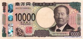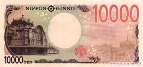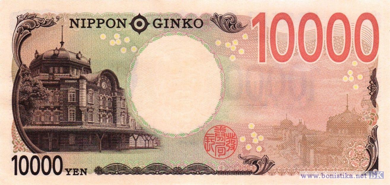Ветвь с листьями и цветками сакуры, или вишни мелкопильчатой (Prunus serrulata) – декоративного дерева семейства розовых, государственный деятель, экономист, промышленник, «отец» японского капитализма Эйити Сибусава. Дерево, фрагмент здания железнодорожного вокзала в бизнес-квартале Маруноути в районе Тиёда в городе Токио в 1914 году, логотип Банка Японии.