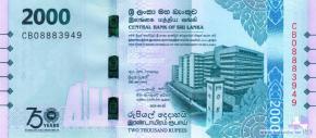 Юбилейная банкнота: 75 лет Центральному банку Шри-Ланки. Логотип празднования 75-летия Центрального банка, стилизованное изображение небоскрёбов и телекоммуникационной башни Нелум Кулуна (Башни Лотоса) в городе Коломбо, здание штаб-квартиры Центрального банка в городе Коломбо, фрагмент часовой башни бывшего маяка в районе Форт в городе Коломбо. Логотип празднования 75-летия Центрального банка, стилизованное изображение карты острова Шри-Ланка, цветок кувшинки звёздчатой (Nymphaea nouchali) – растения семейства кувшинковых, является национальным цветком Шри-Ланки.