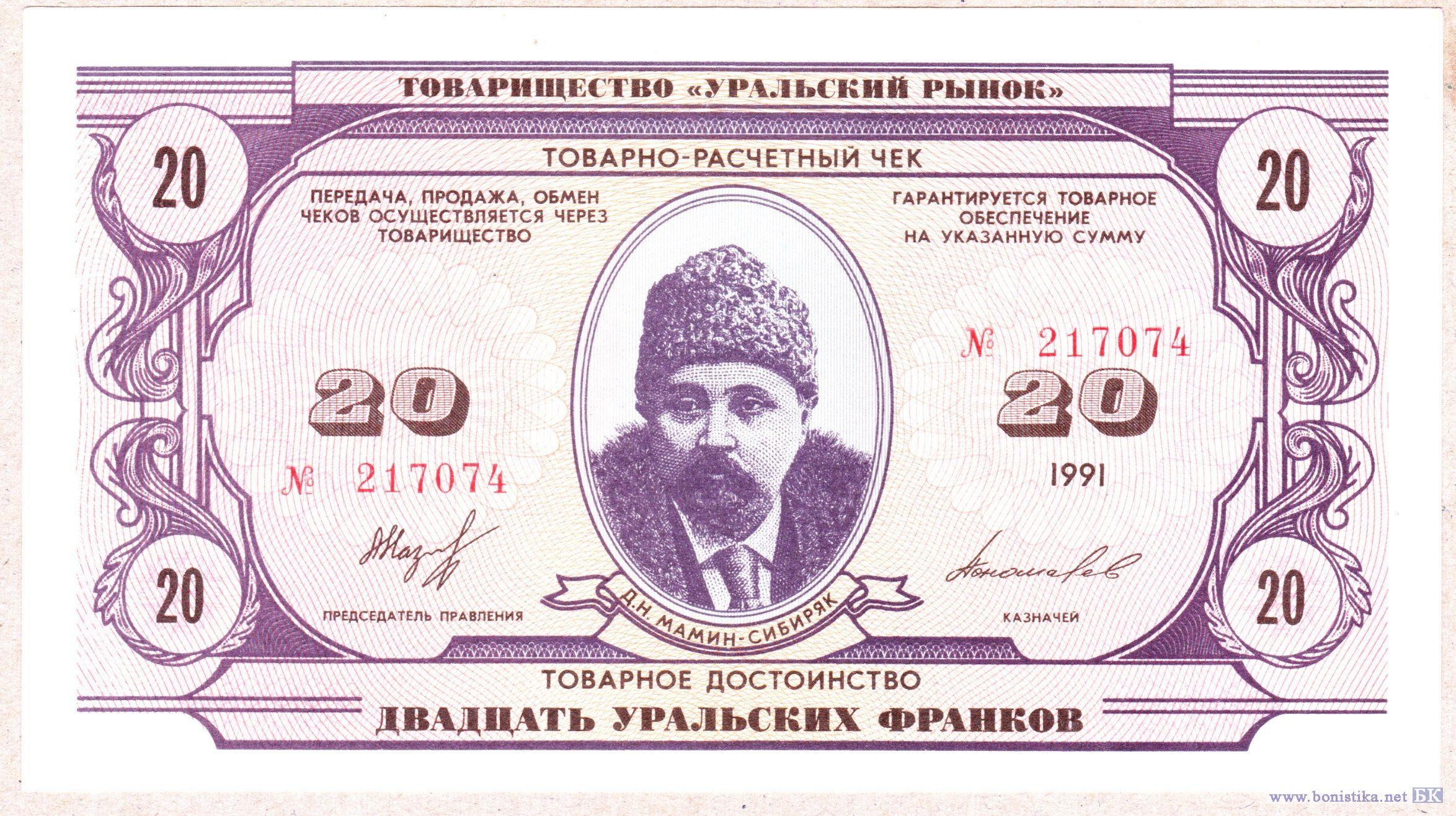 Товарно-расчётные чеки «уральские франки» были изготовлены в 1991 году на Пермской печатной фабрике «Гознак» по заказу екатеринбургского предприятия ТОО «Уральский рынок» и в соответствии с письмом-разрешением государственного производственного объединения производства государственных знаков Министерства финансов СССР от 04.09.91 г. № 01/2а-106 . Отпечатано было 1 миллион 930 тысяч штук номиналами 1, 5 10, 20, 50, 100, 500 и 1000 «уральских франков» на общую сумму в 56 млн. франков.