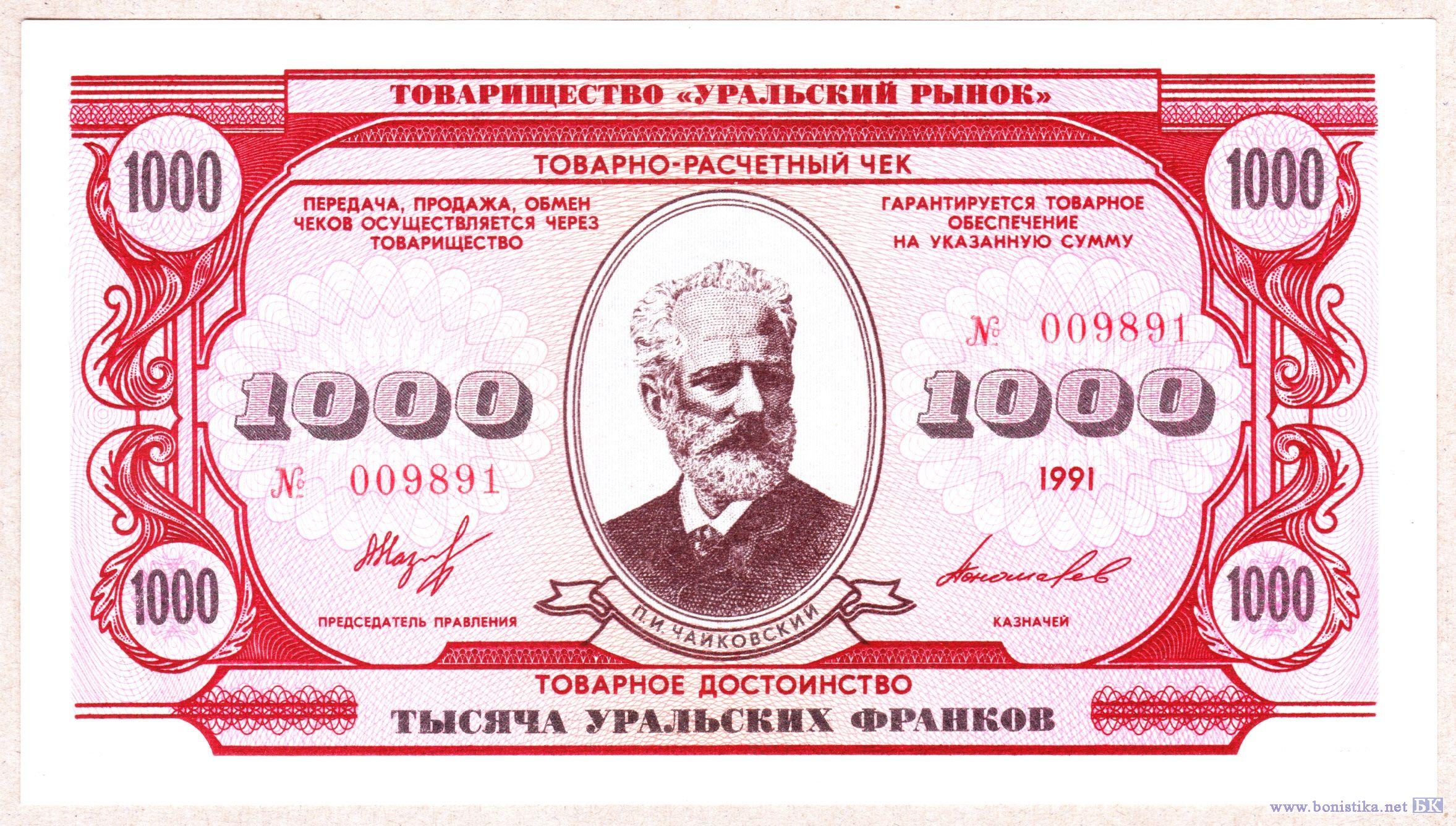 Товарно-расчётные чеки «уральские франки» были изготовлены в 1991 году на Пермской печатной фабрике «Гознак» по заказу екатеринбургского предприятия ТОО «Уральский рынок» и в соответствии с письмом-разрешением государственного производственного объединения производства государственных знаков Министерства финансов СССР от 04.09.91 г. № 01/2а-106 . Отпечатано было 1 миллион 930 тысяч штук номиналами 1, 5 10, 20, 50, 100, 500 и 1000 «уральских франков» на общую сумму в 56 млн. франков.