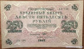 Государственный кредитный билет номиналом 250 рублей образца 1917 года. Согласно постановлению Временного правительства от 22 августа 1917 года, возглавляемого Керенским А. Ф.,