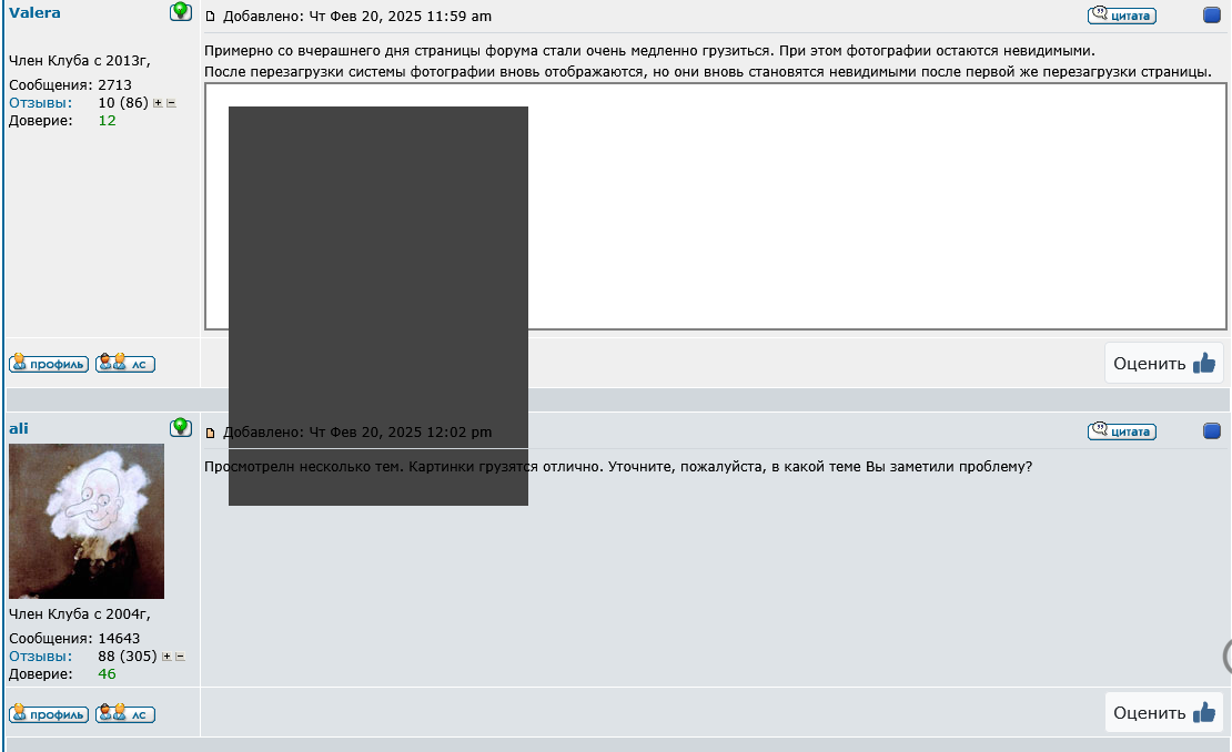 Примерно со вчерашнего дня страницы форума стали очень медленно грузиться. При этом фотографии остаются невидимыми.