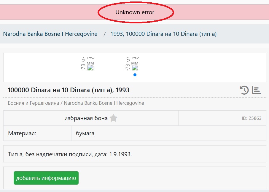 Теперь эта ошибка высвечивается и при добавлении материала к уже существующим в Каталоге, и при добавлении новой банкноты. И не понятно из-за неё - прошёл добавленный материал или нет. |