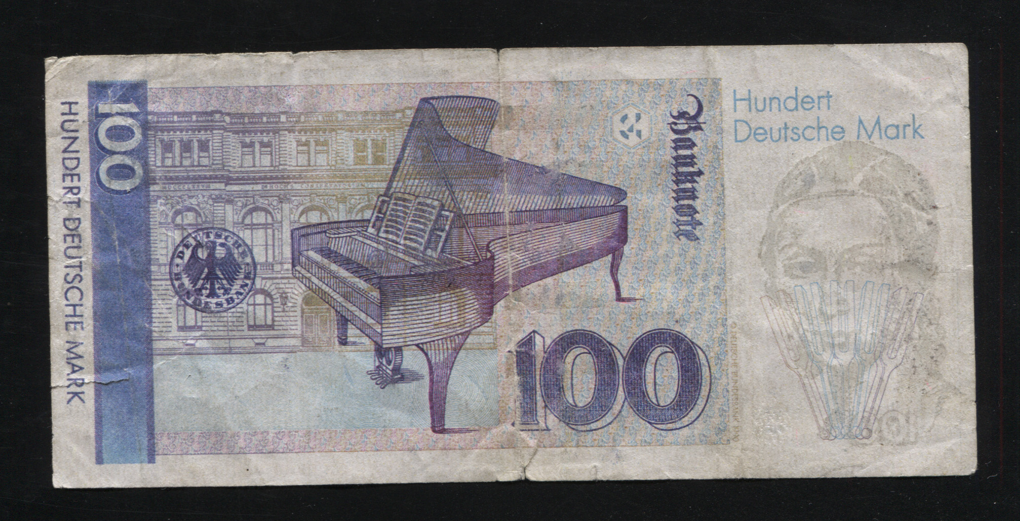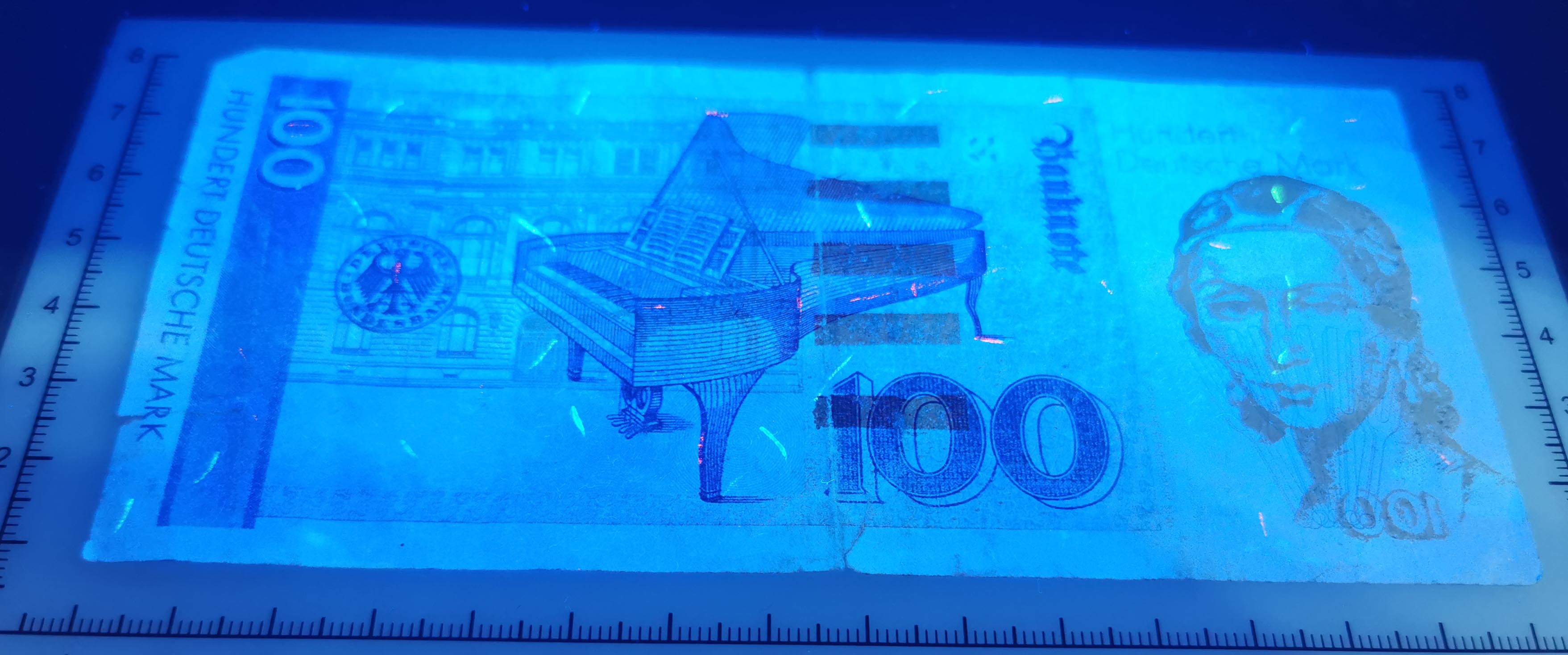 Я держал такие банкноты в руках многократно, пребывая в Германии, но уже толком и не помню, как они выглядели. В коллекции оставил 5, 10 и 20 марок. На них в отражённом свете водяной знак так не виден, как на этой с обратной стороны. Смущает номер банкноты, который, как мне кажется, начал расползаться и стал не резким. Про состояние банкноты не говорю, убитая она в хлам. Возможно это сделано специально, так как немецкая марка до сих пор обменивается на евро без ограничений, их обмен прекращён не будет. Эх, жаль не с чем сравнить, и по снимкам не определить тип печати.