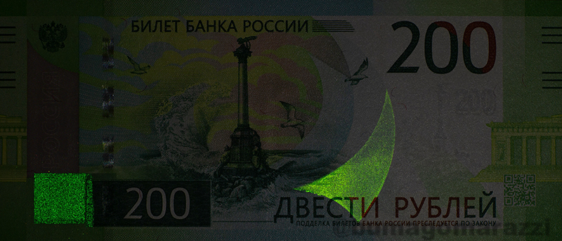 Новые 200 рублей тоже не впечатляли внешним видом и были максимально утилитарны: крупные цифры номинала, отличный от других банкнот "основной" цвет, защитные признаки не хуже, чем у сотни. В инфракрасном диапазоне можно обнаружить интересное явление - все краски являются ИК-прозрачными, что позволяет увидеть "голую" бумагу.