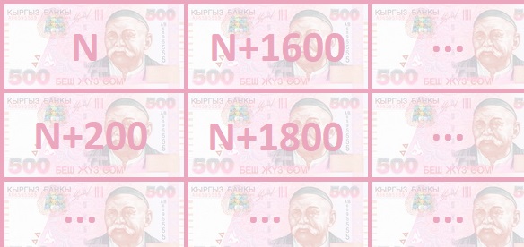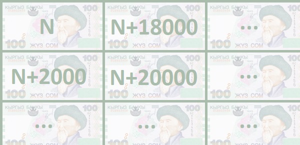 Но вернемся к третьему выпуску Киргизии. Итак, невооруженным взглядом видно, что изменения серии на листе не наблюдается, а уникальность обеспечивается некоторым математическим сдвигом в номере (кстати, аналогичная схема использовалась для того самого листа сторублевок серии сН). Итак, схема: каждая банкнота, расположенная ниже текущей, имеет номер на P больше, чем текущая. Тогда банкнота, расположенная правее текущей будет иметь номер P*R, где R - это количество банкнот на листе по строкам. К сожалению, не имея полного листа, невозможно как-то вычислить количество столбцов банкнот (обозначим это количество как C)... От чего зависит число P - не совсем понятно, так как оно различается в разных нарезках даже для одного номинала. По моим предположениям, P - это количество листов в партии, отправленной на нумерацию. Таким образом, после нумерации и разрезки всей партии получаются банкноты, пронумерованные от N до N+P*(R-1)*(C-1); машинке для нумерации (или ее оператору) остается лишь запомнить это число и использовать его когда придет на нумерацию следующая партия. В картинках прикреплю иллюстрацию к этой схеме.