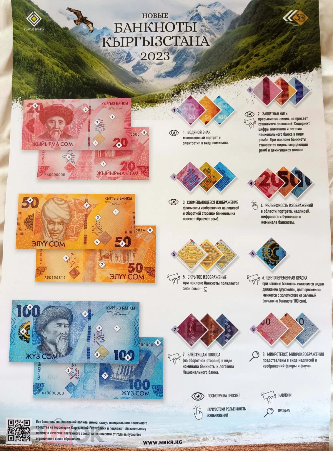 Национальный банк Кыргызской Республики в соответствии с конституционным Законом Кыргызской Республики «О Национальном банке Кыргызской Республики» с 15 февраля 2024 года вводит в обращение банкноты номиналами 20, 50 и 100 сомов новой пятой серии национальной валюты образца 2023 года.