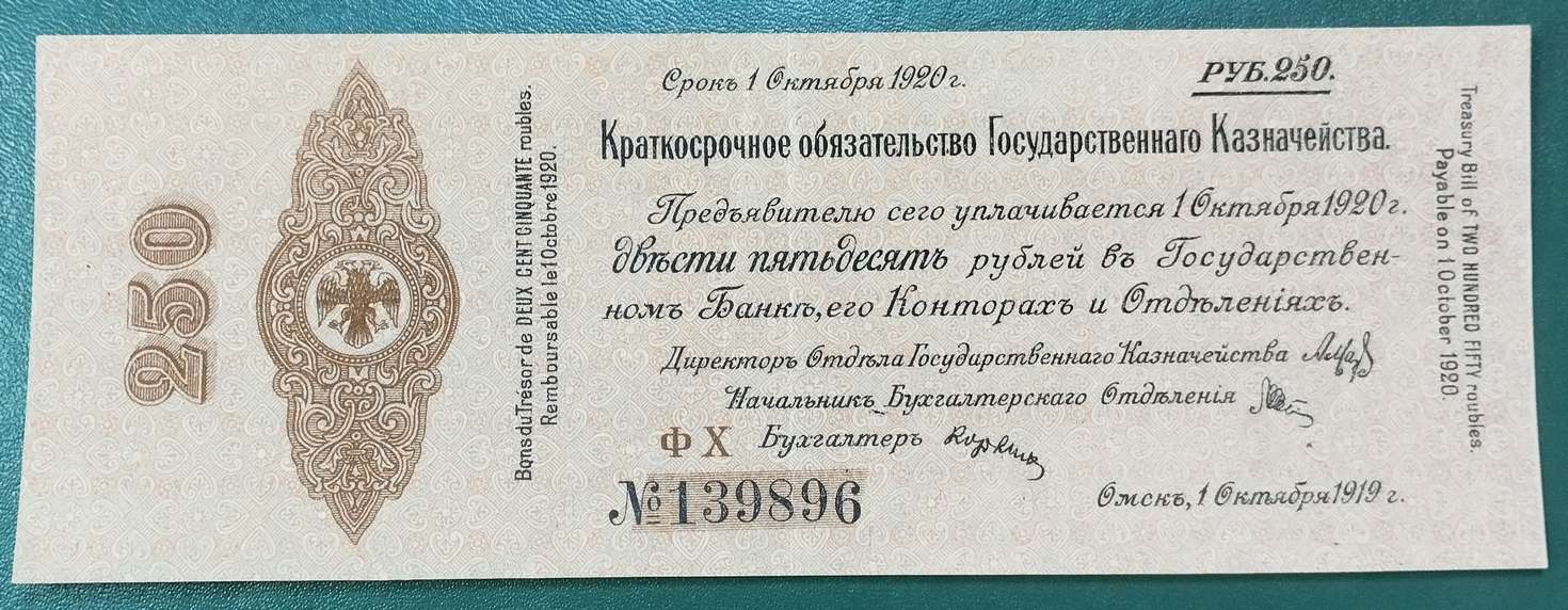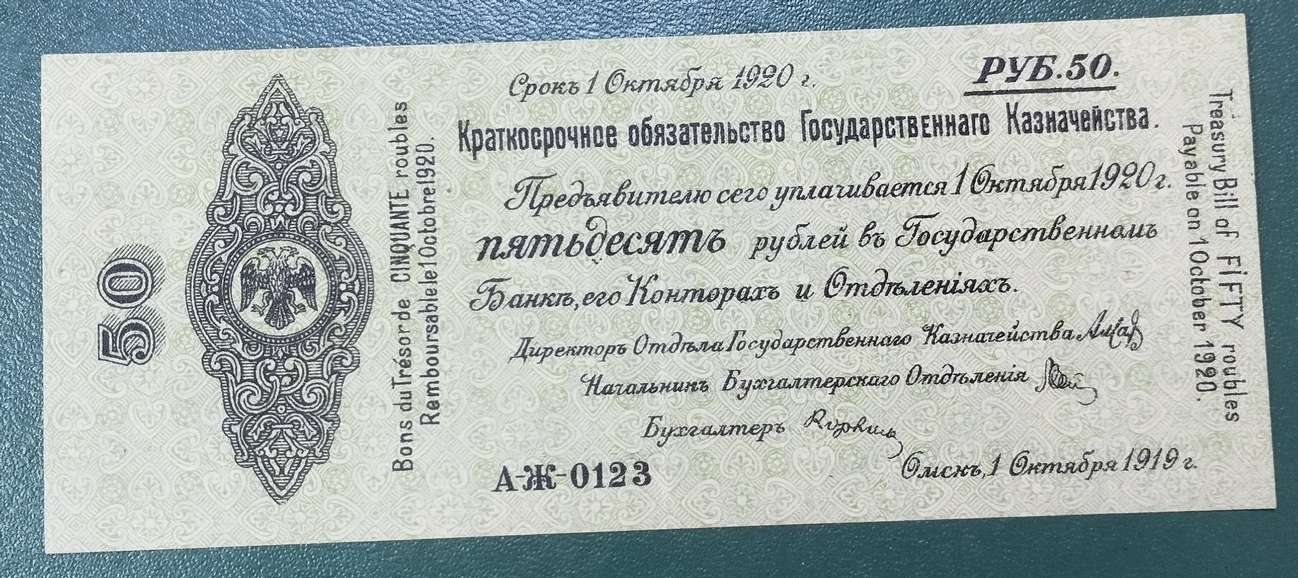 Прошу оценить краткосрочные обязательства Государственного Казначейства с водяными знаками, 50, 250 и 1000 рублей. г. Омск 1919г.