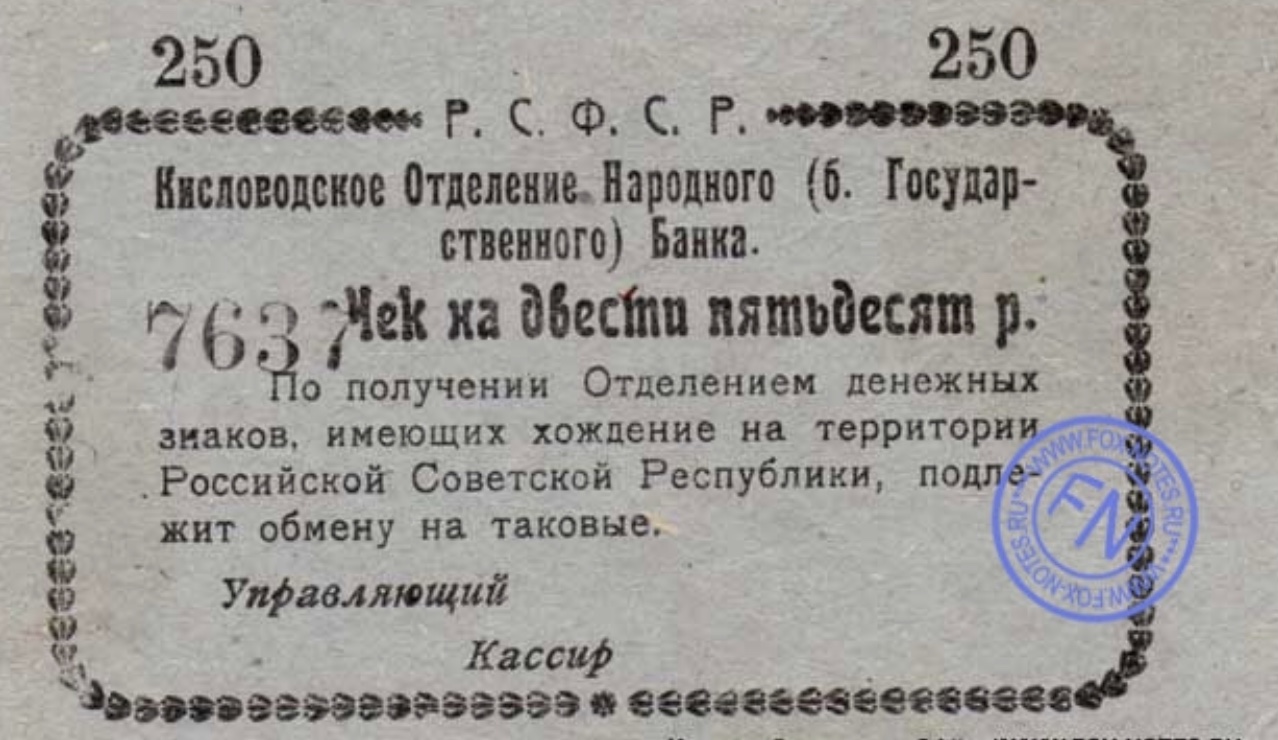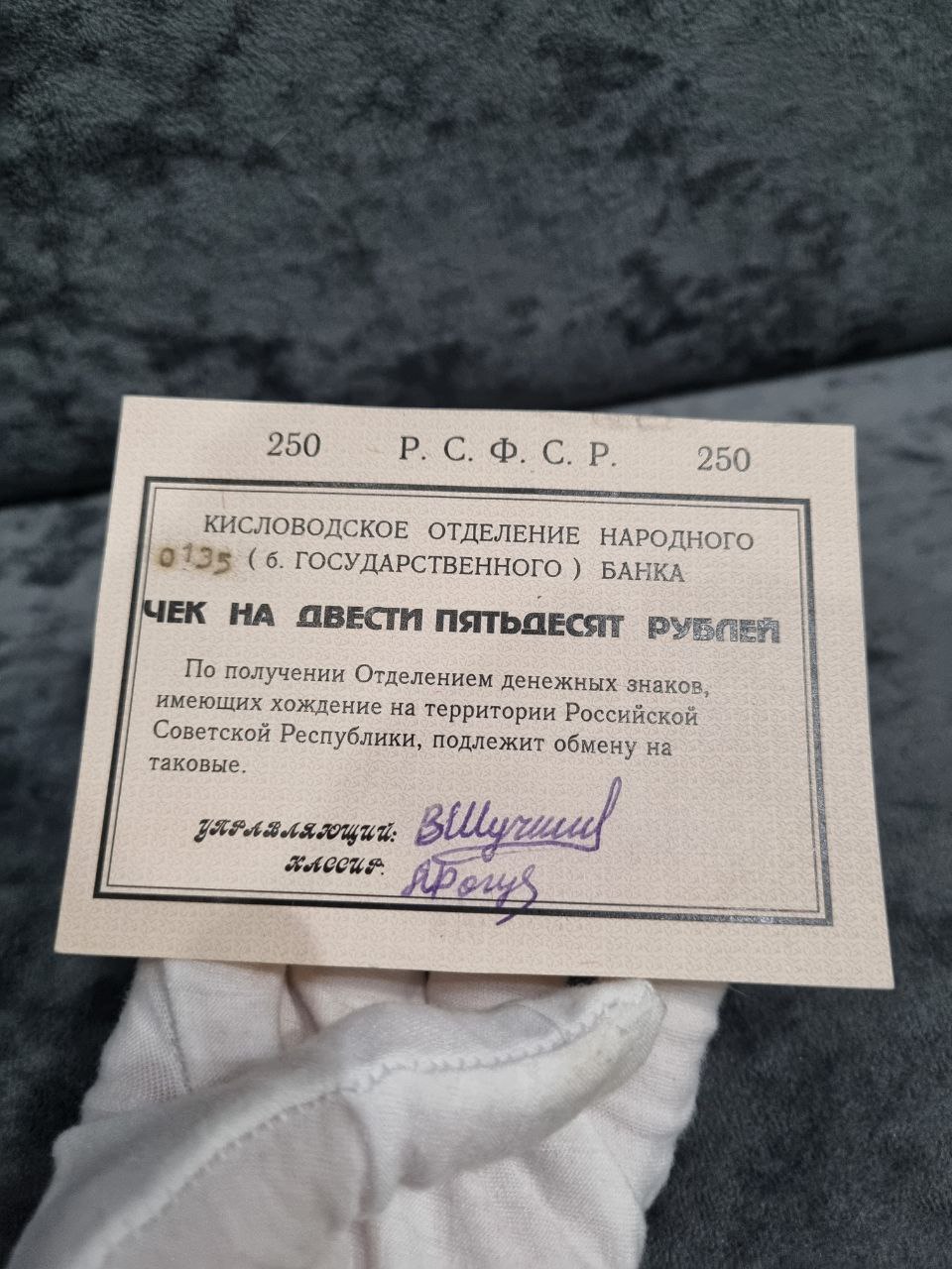РСФСР чек на 250 рублей Кисловодск Кисловодское отделение банка