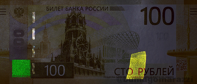 Обнародованные недавно Центробанком 100 рублей ожидаемо имеют антистокс защиту и в лучших традициях Гознака развивают идею меток люминесценции с разными оттенками - аналогично банкнотам в 200 и 2000 рублей, выпущенным в 2017.