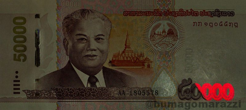 Лаосские новинки, выпущенные Гознаком, также имеют антистокс защиту. Антистоксовые метки имеют не только различное расположение для разных номиналов, но и различный цвет - оранжевый и красный. Нанесение люминофора достаточно плотное, не чета первым выпускам 10.000 и 20.000 кипов, свечение детектируется уверенно.