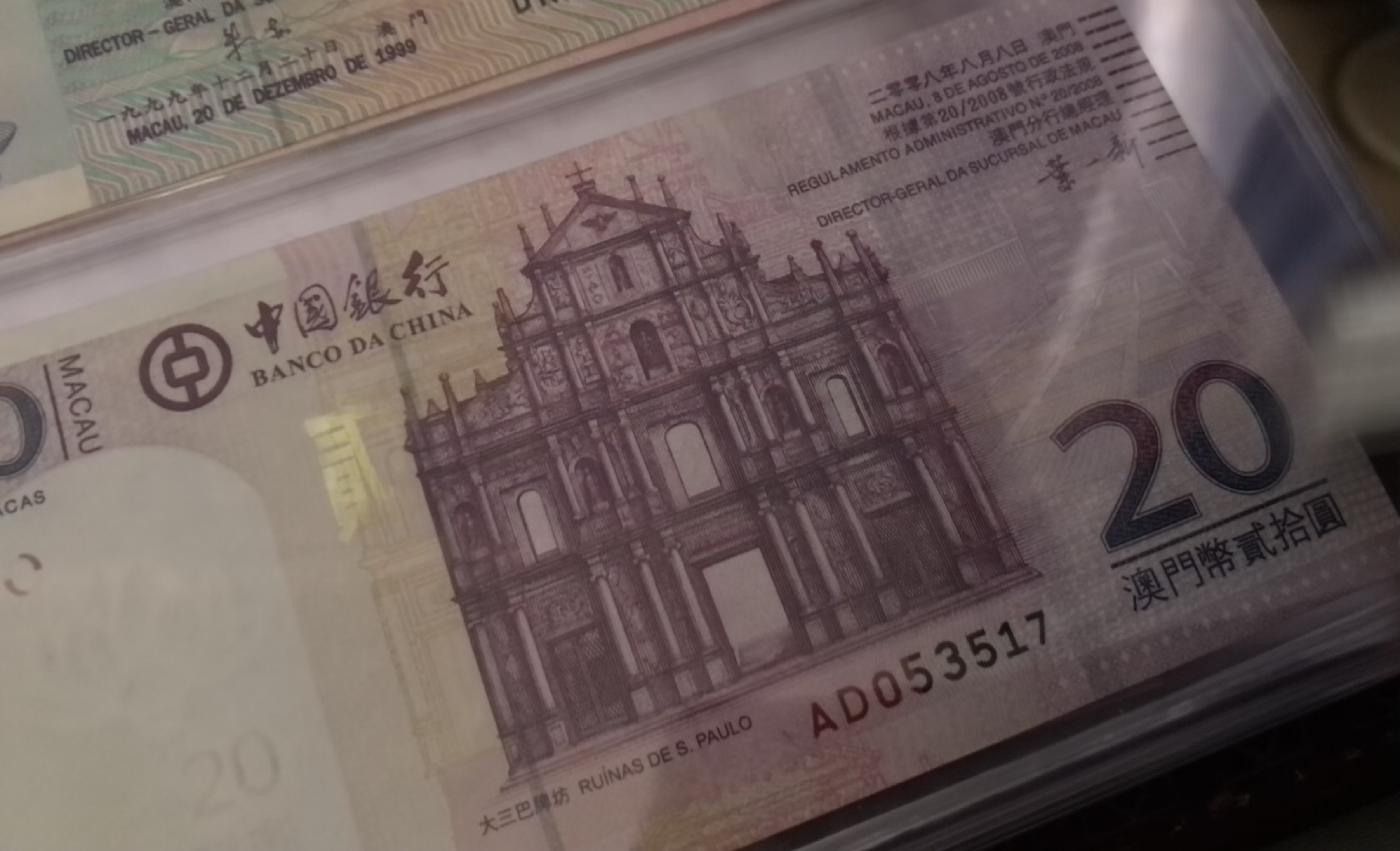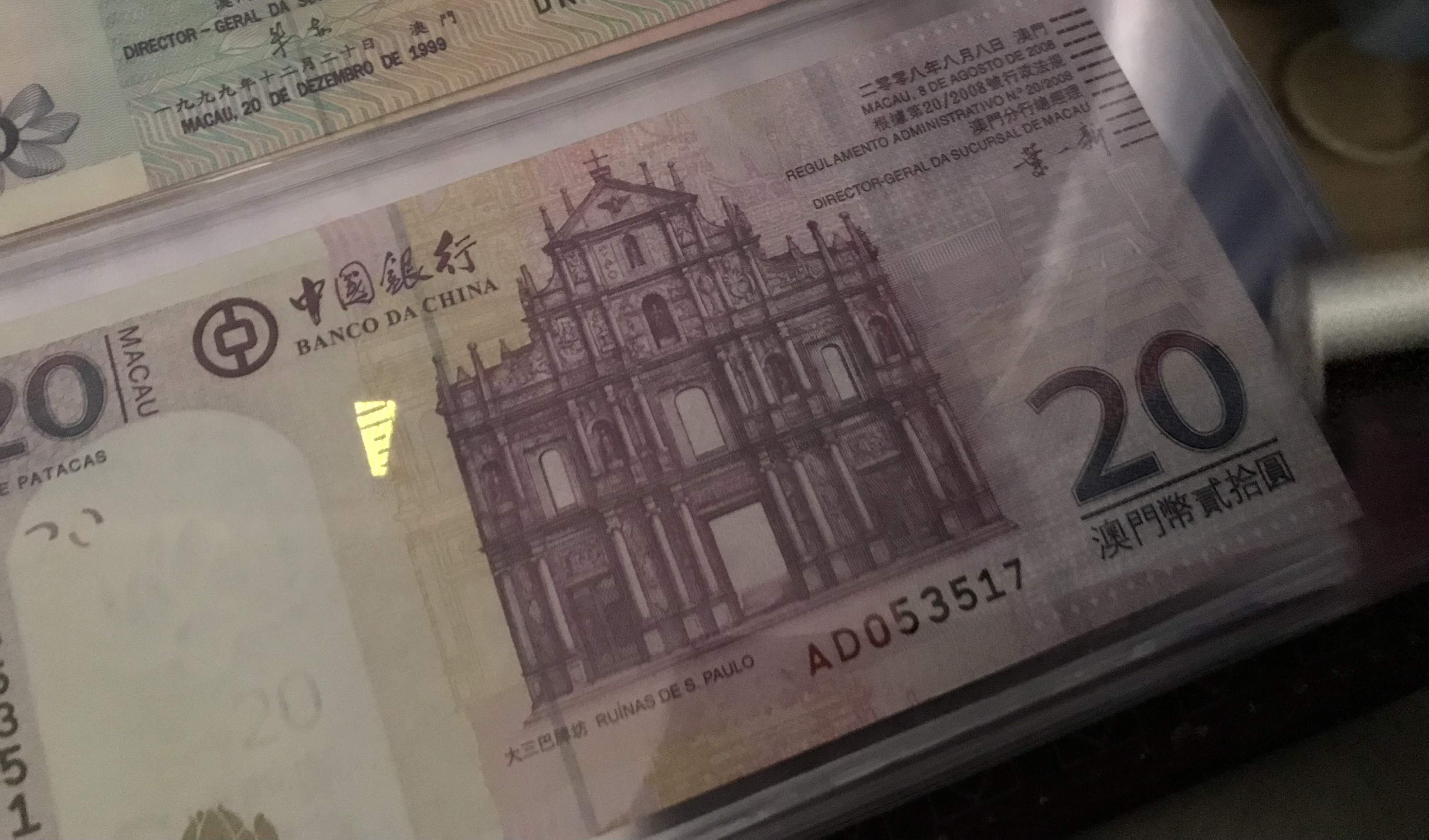 Но зато повезло на другой Олимпиаде - тоже пекинской, но прошедшей в 2008 году. Напомню, ей посвящались сразу три банкноты: 10 юаней Народного банка Китая, 20 гонконгских долларов Банка Китая и 20 макаоских патак Банка Китая. К сожалению, 10 юаней мне недоступны, а вот две оставшиеся удалось изучить, и на одной из них - удача! - присутствует метка, выполненная антистоксовыми люминофорами.