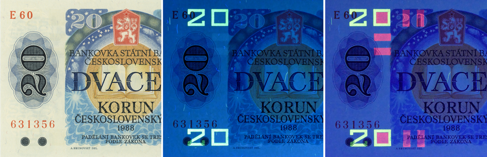 The Czech 1988 20 Korun is the earliest example I have in my collection, currently. Under UVC red blocks appear.