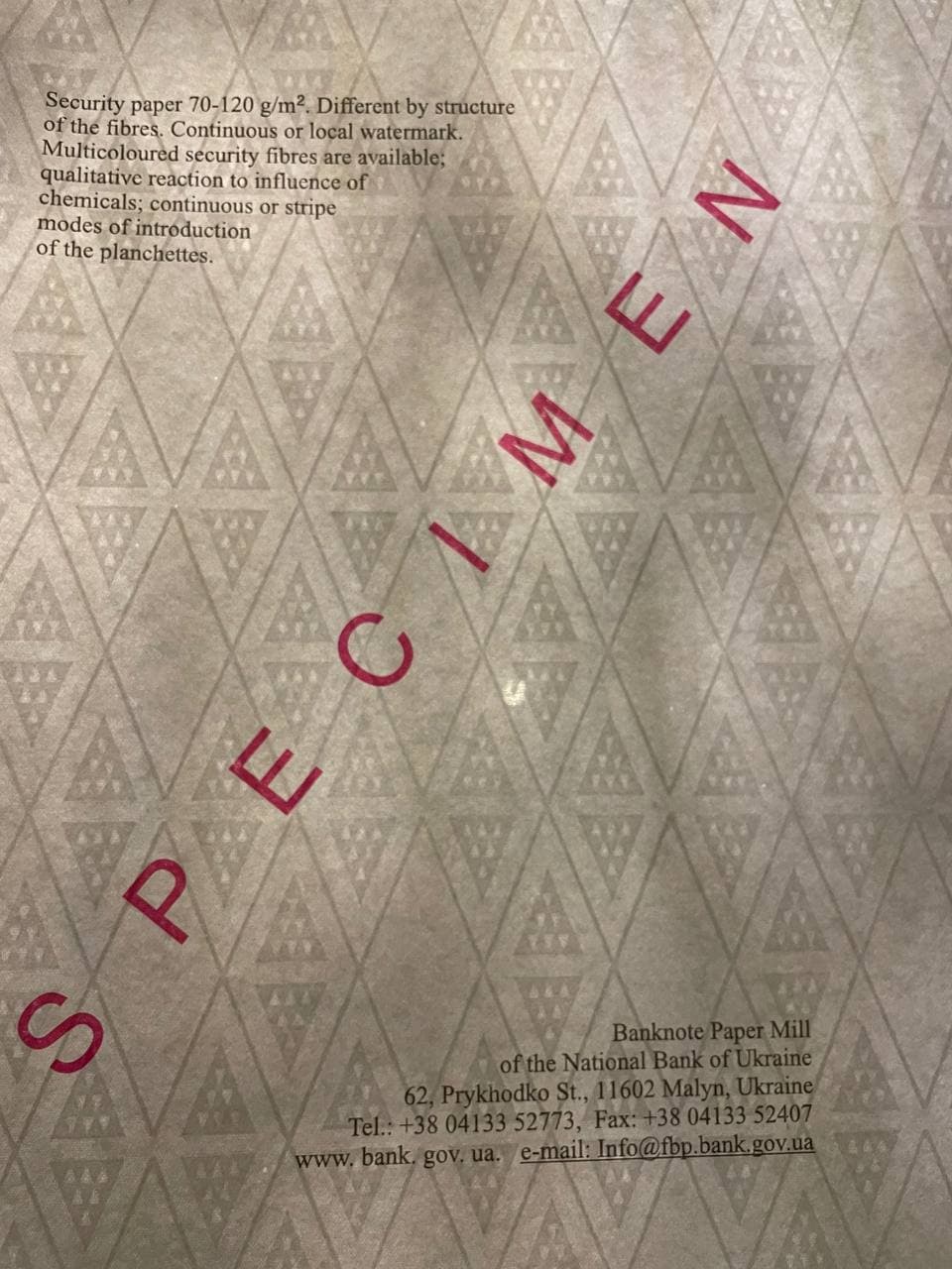 "Дані зразки надруковані на захисній бумазі виготовленій на Малинській фабриці та на виробничих потужностях останньої, у спосіб, який можливий для сувенірної продукції."