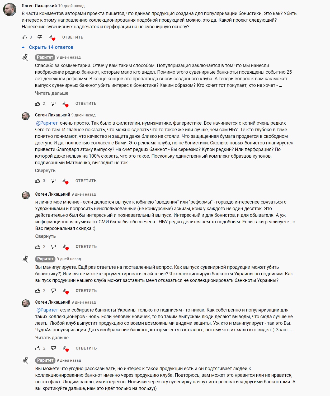 Шановний «Бьёрн»! З розумінням відношуся до Вашого бажання «встановити істину», хоча на мою думку воно надто прискіпливе тимпак методи реалізації свого бажання! Повторюся, «агресія» з Вашого боку та деяких інших учасників «даного процесу» не викликає бажання, вже з нашого боку, продовжувати предметний діалог! КК «Раритет» випустив власну сувенірну продукцію за власною ідеологією без зазіхань на погляди та права вибору інших колекціонерів. Маю надію, що через деякий час Ви та інші колекціонери змінять своє ставлення до КК «Рапитет», як організації, що має на меті багато цікавих проектів, в першу чергу накопичення, вивчення, аналіз та стстематизацію предметів колекціонування, зокрема шляхом друку відповідних праць! З Повагою!