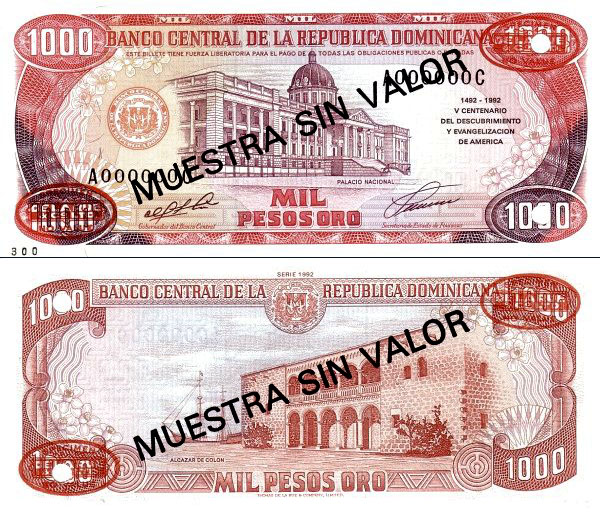 Еще 3 банкноты Доминиканской республики посвященные 500 летию открытия Америки: 20, 500, 1000 песо 1992 с памятными надпечатками. на 1000 по описанию, еще кроме памятной надпечатки, должен быть водяной знак Колумб.