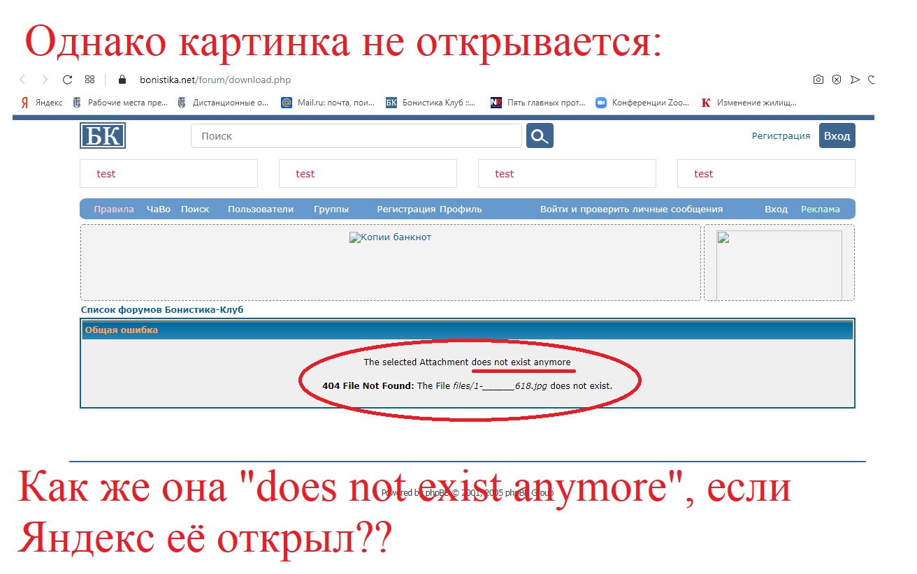 При Яндекс-поиске неожиданно увидел известную мне картинку с "погибшей" части форума. Открывается и увеличивается в Яндекс-картинках. Источником указан Бонистика-клуб, название файла как на форуме. При переходе на источник открывается та самая страница форума, на которой картинка располагается, однако открыть из форума картинку не могу: does not exist.