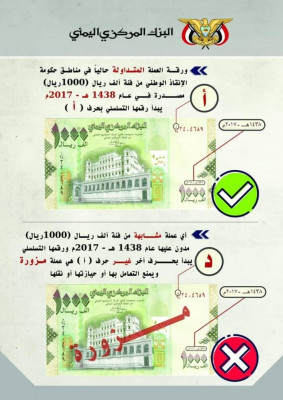 Центробанк в Адене выпустил в обращение 1000 риалов со старой подписью и датой 2017 г. Центробанк в Сане считает эти риалы фальшивыми (буква D в префиксе) в отличие от ранних 2017 г. ( буква A в префиксе).