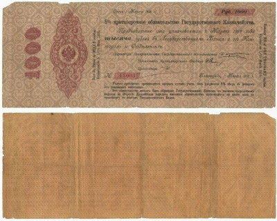 5% Краткосрочное Обязательство Государственного Казначейства. 1000 рублей, годичное, март1917года, сохранность на скане.