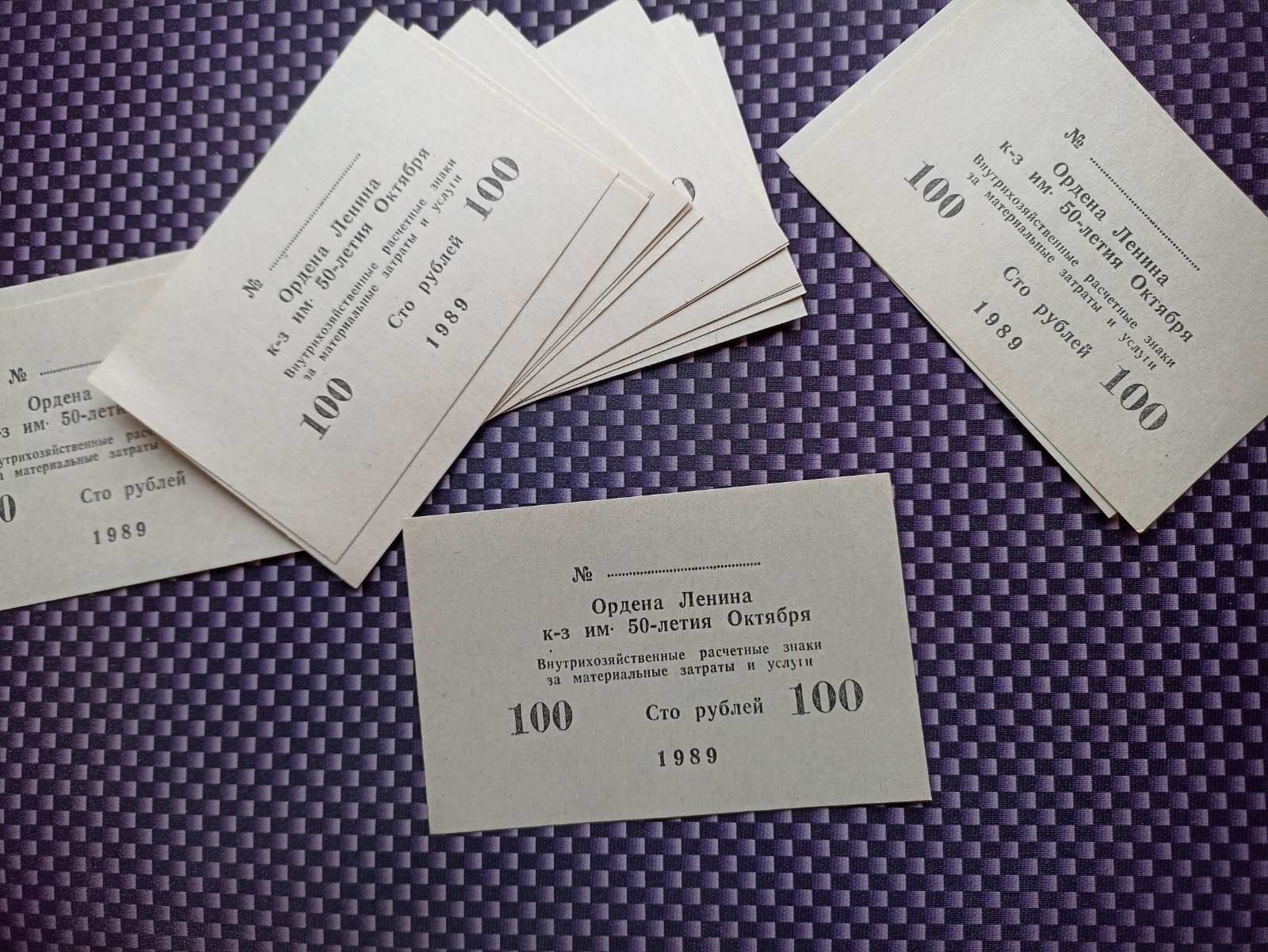 18 банкнот Ордена Ленина колхоз им. 50-летия Октября. Внутрихозяйственные расчетные знаки за материальные затраты и услуги. Село Воронково Рыбницкого района МССР. Номинал 100 рублей. 1989г. Доставка заказной почтой в любую страну за счет покупателя.