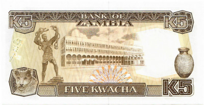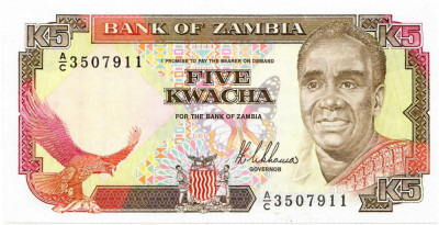 Описание лота: Билет Банка Замбии номиналом 5 квач выпуска (1989) года. 8-й вариант подписи. Без замечаний.