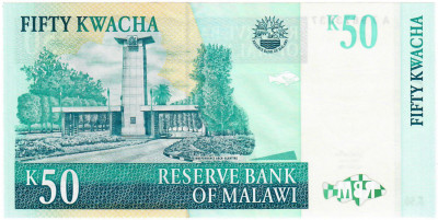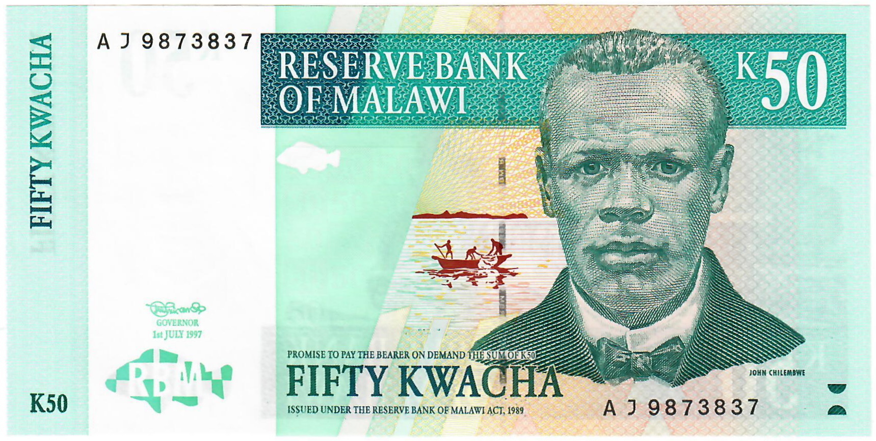 Описание лота: Билет Резервного банка Малави номиналом 50 квач выпуска 1.7.1997 года. Выгиб верхней кромки в месте захода металлизированной защитной нити.