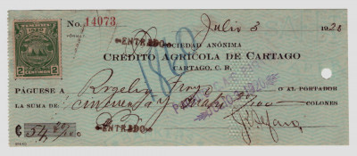Описание лота: Банковский чек 1920 год. Коста Рика