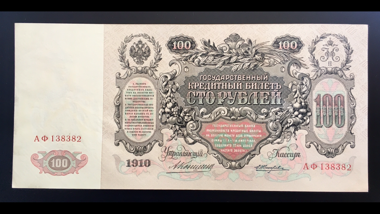Больше всего меня порадовала 100 рублей 1910 года в сохранности UNC с редким сочетанием подписей управляющего и кассира.