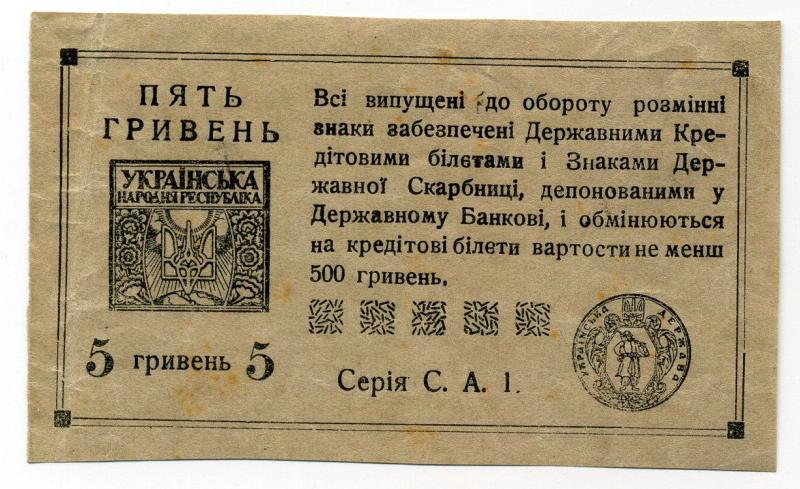 Для того чтобы закончить полуфабрикаты в 5 гривен, напечатанные черной краской в Станиславове и привезенные в Каменец в количестве 34 пачек, была реквизирована единственная в Каменец-Подольском литография. В этой литографии никаких скоропечатных машин не оказалось, а имелись только пять ручных переводных станков, из которых лишь только один оказался вполне способным, а остальные требовали ремонта.