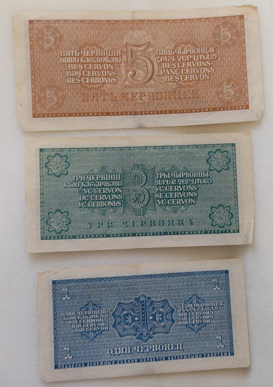"Час від часу на іноземних аукціонах з'являються банкноти 5 червінців, так, у жовтні 2014 року банкноту з серійним № 3.0310655 було продано на аукціоні російського аукціонного дому «ЗНАКЪ», у жовтні 2016 року банкнота з серійним № 4.0310686 була продана на 35-му аукціоні німецького аукціонного дому «Christoph Gärtner GmbH & Co. KG», у червні 2017 року банкноту з серійним № 3.0059902 було продано на 37-му аукціоні «Christoph Gärtner GmbH & Co. KG»."